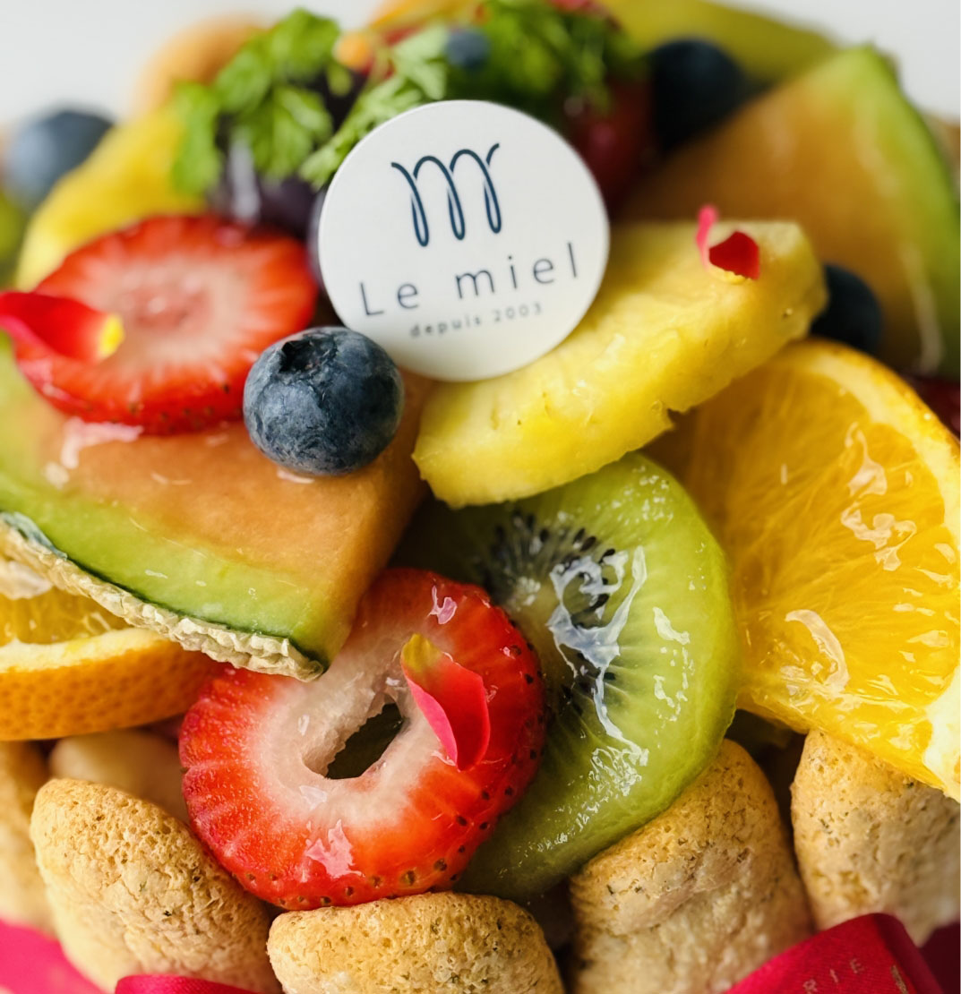 苺2層のイチゴサンドの生クリームデコレーションをサクサクのアーモンド生地で囲み季節のフルーツを飾りました。