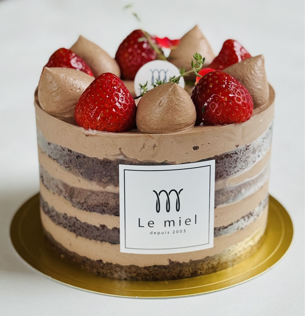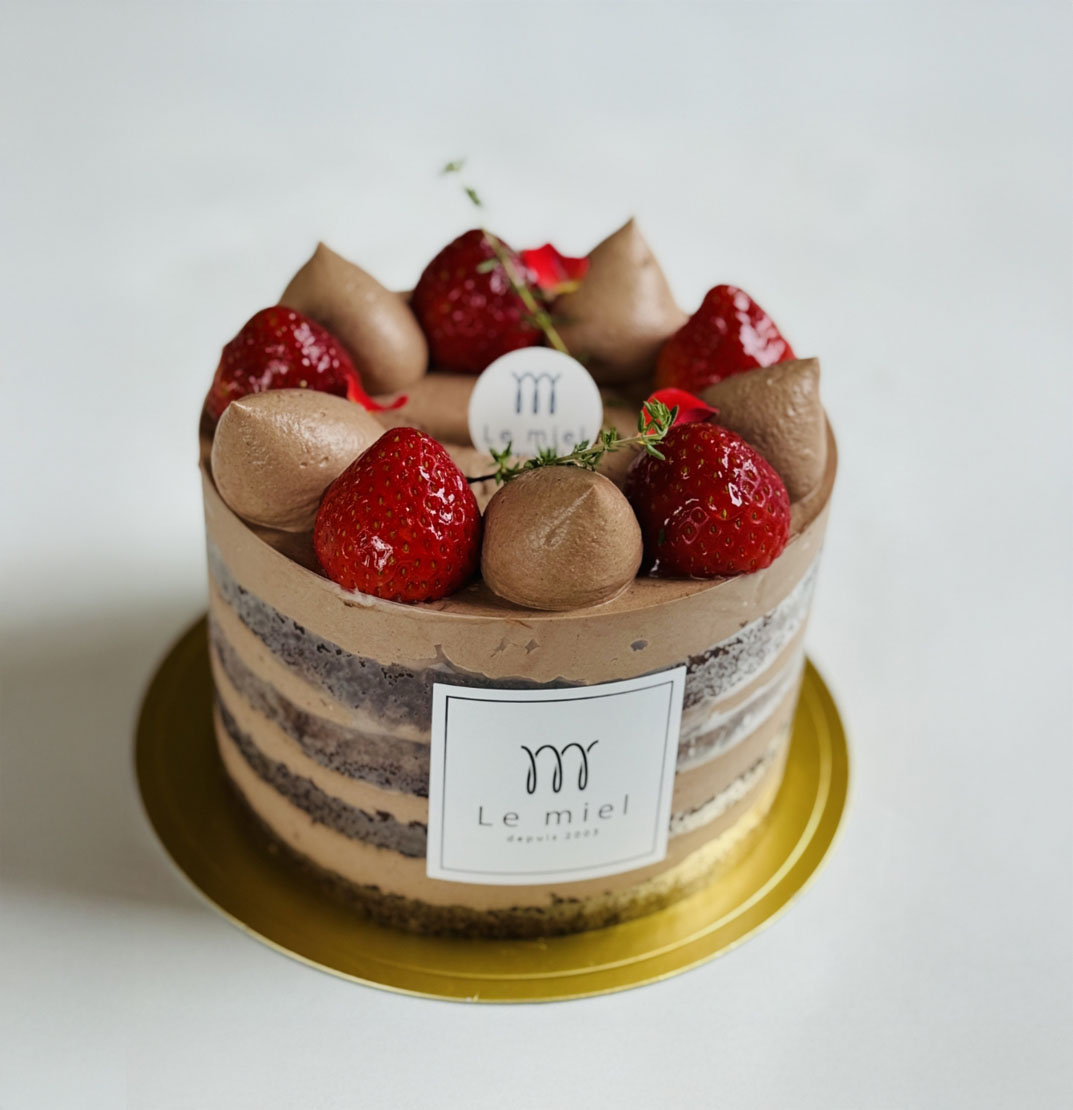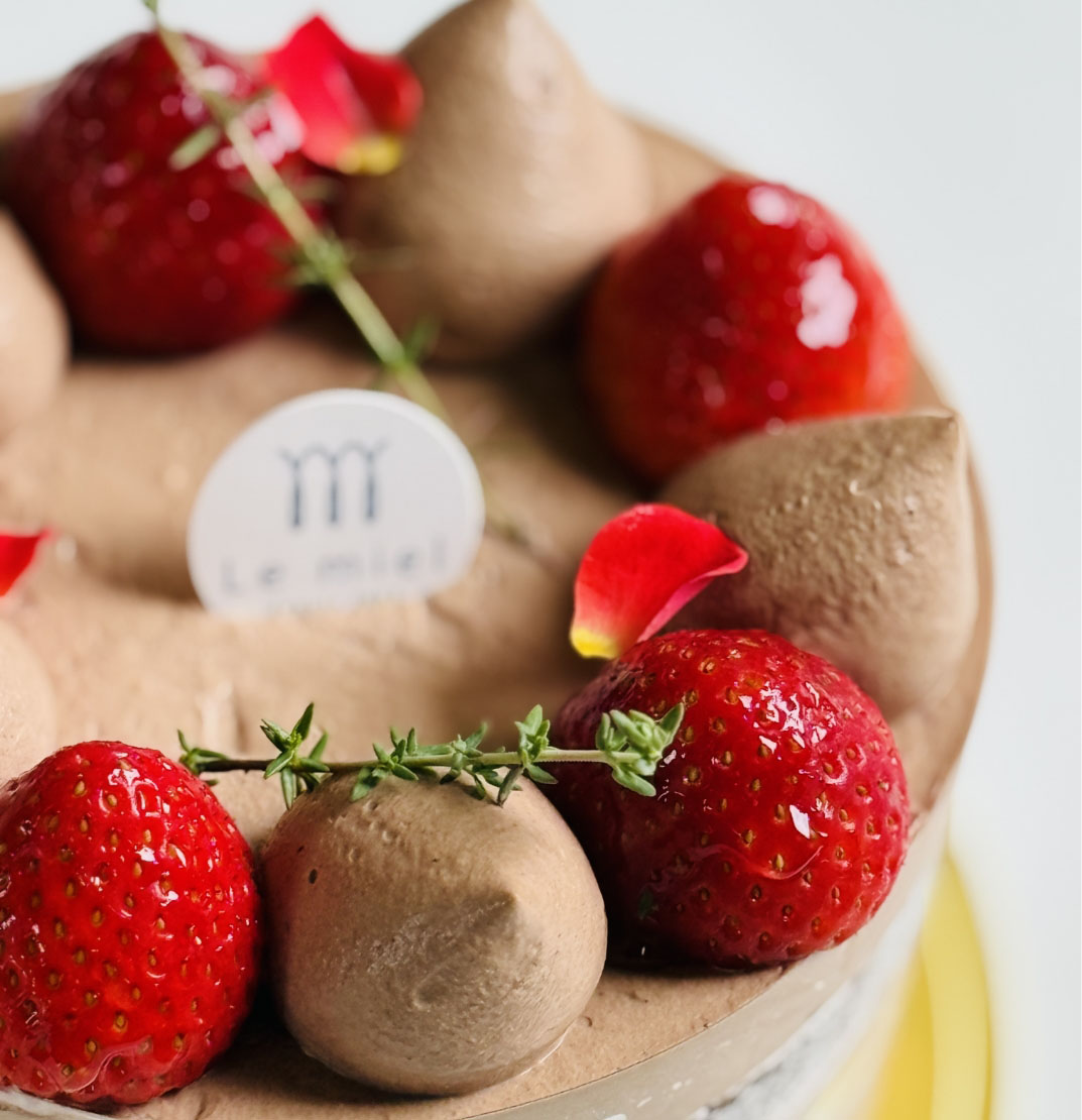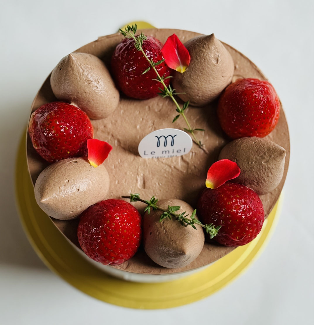 純正生クリームにベルギー産のチョコレートを合わせたクリームに新鮮ないちごを飾りました。