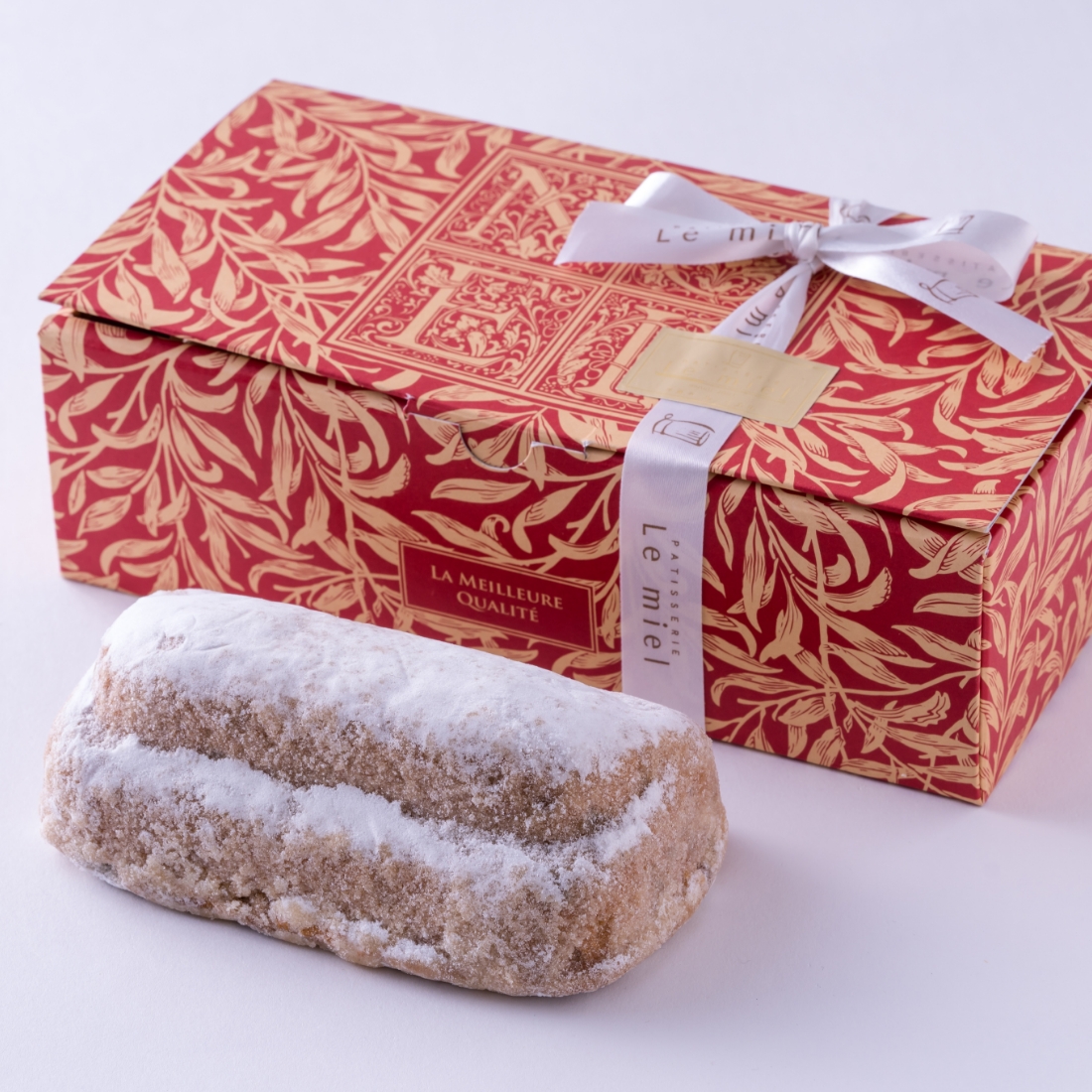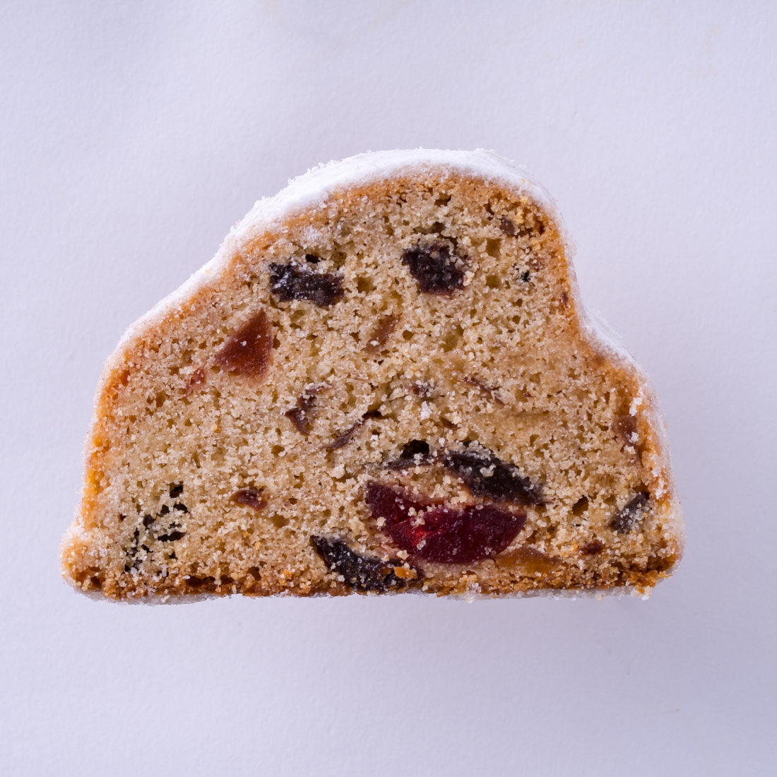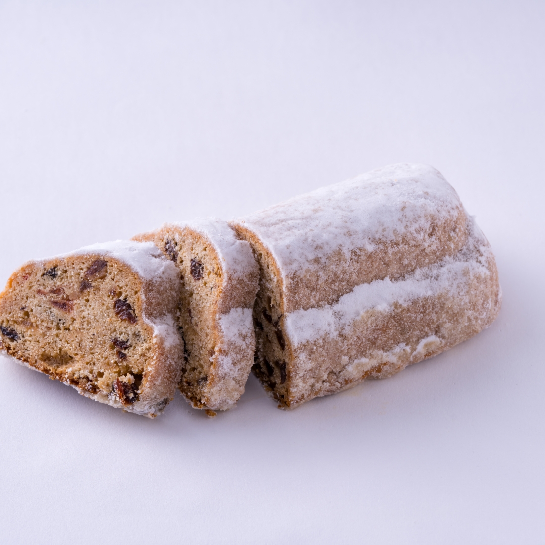 ラム酒に漬け込んだたっぷりのドライフルーツを混ぜ合わせ焼き、溶かしたたっぷりの醗酵バターに焼いた生地をつけてバターを生地にしみこませます。そのあと粉糖をたっぷりかけて仕上げました。