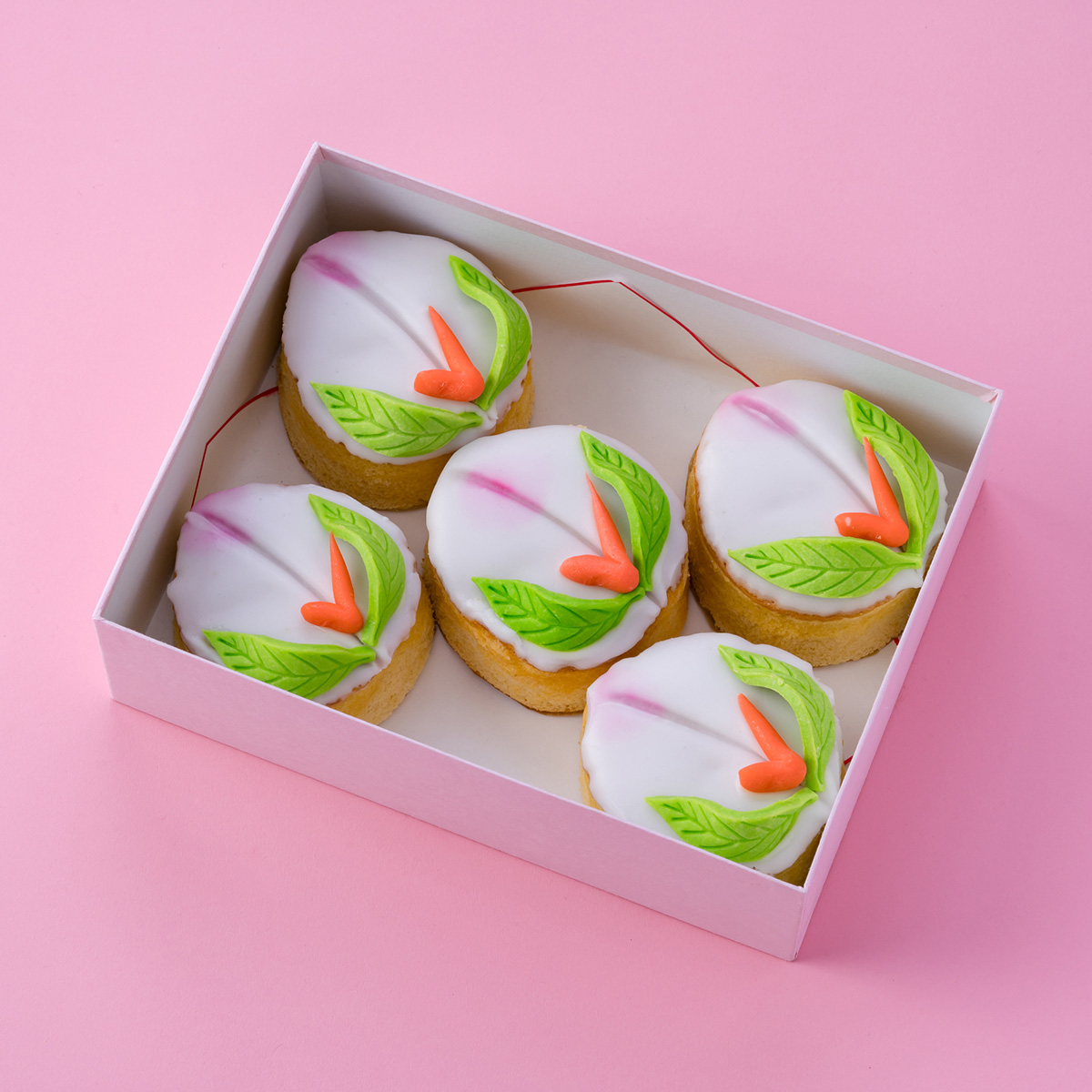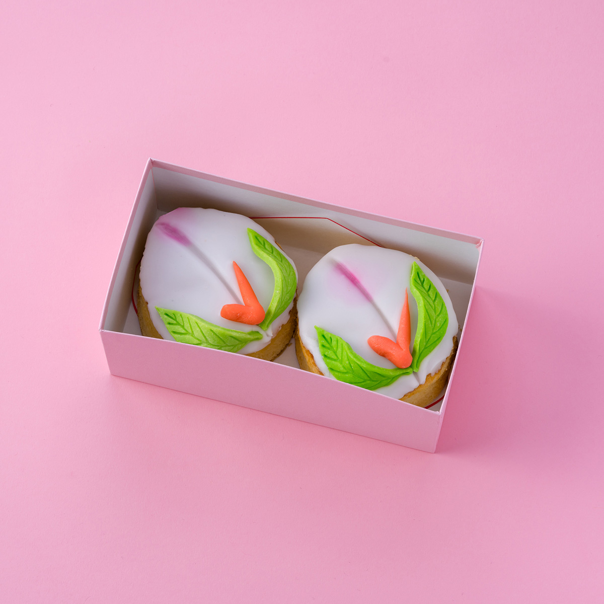 驚くほどしっとりしたかすてら生地とすり蜜の絶妙なバランスが特徴のあづま屋の桃かすてら。洋菓子職人がカステラを焼き和菓子職人がフォンダンをかける。葉っぱと枝も一つ一つ和菓子職人の手作業で作っています。味はもちろん見た目の美しさにもこだわった上質な桃かすてらです。大サイズよりもひとまわり小さい食べやすいサイズになっています。