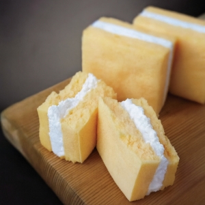 ラム酒に漬け込んだたっぷりのドライフルーツを混ぜ合わせ焼き、溶かしたたっぷりの醗酵バターに焼いた生地をつけてバターを生地にしみこませます。そのあと粉糖をたっぷりかけて仕上げました。厳選した材料を使用しフルーツケーキのようなしっとりとしたケーキ屋さんのシュトーレンに仕上げました。
